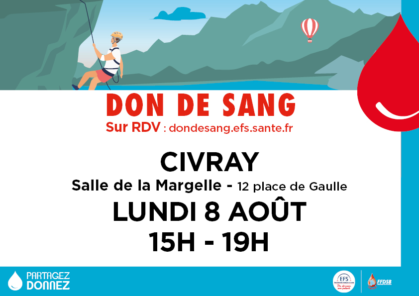 Prochaine collecte de sang à Civray lundi 8 août 15h – 19h.
